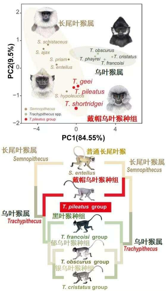 “‘戴帽乌叶猴种组’是研究混合性状演化机制的天然模型,揭开它的进化身世之谜在物种演化史上具有重要意义。”论文通讯作者、西北大学教授齐晓光表示,戴帽乌叶种组分布于与长尾叶猴属的过渡区域,有科学家曾推测,戴帽乌叶猴之所以长得像长尾叶猴,是因为两者发生了杂交。